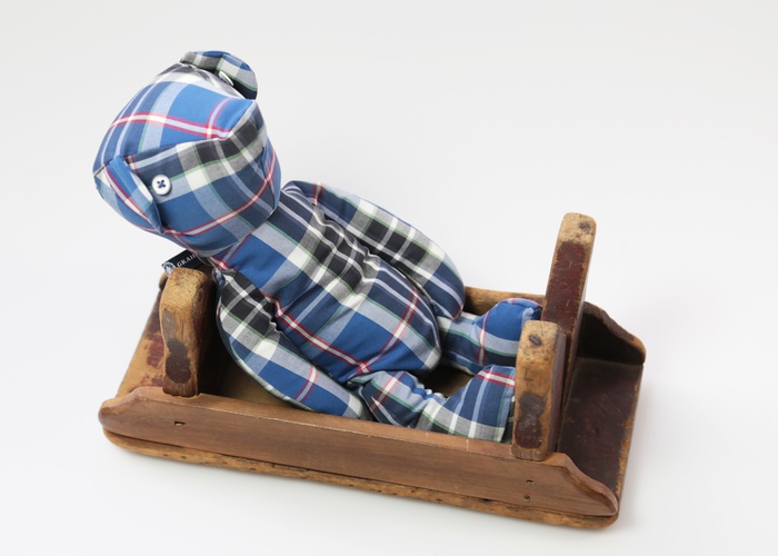Soft blue polka-dot bear by Grahame Fowler made in our New York studio. 30% of purchase goes to the Fashion & Textile Children's Trust.