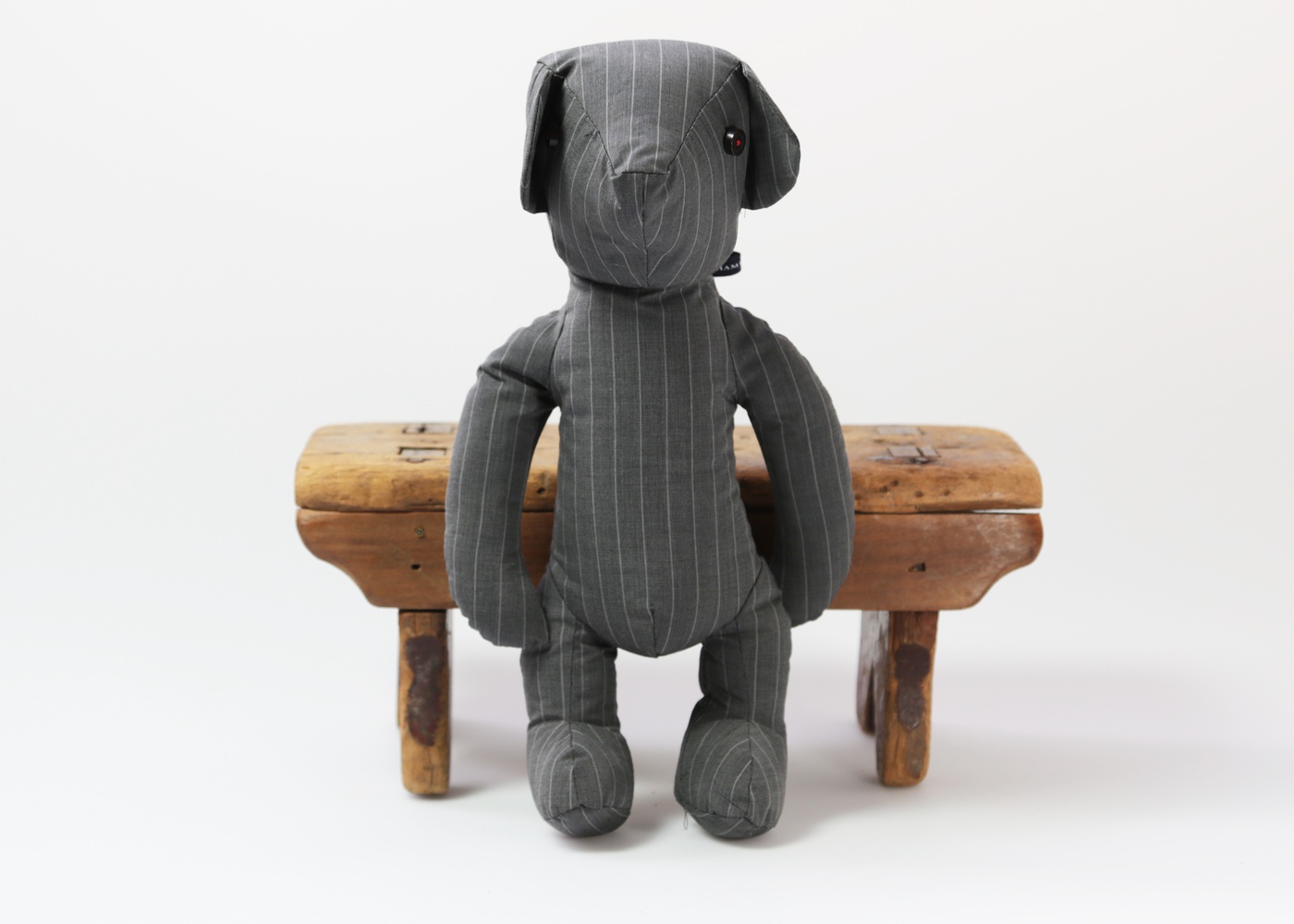 Soft Grey with White Pin Stripes Bear by Grahame Fowler made in our New York studio. 30% of purchase goes to the Fashion & Textile Children’s Trust.